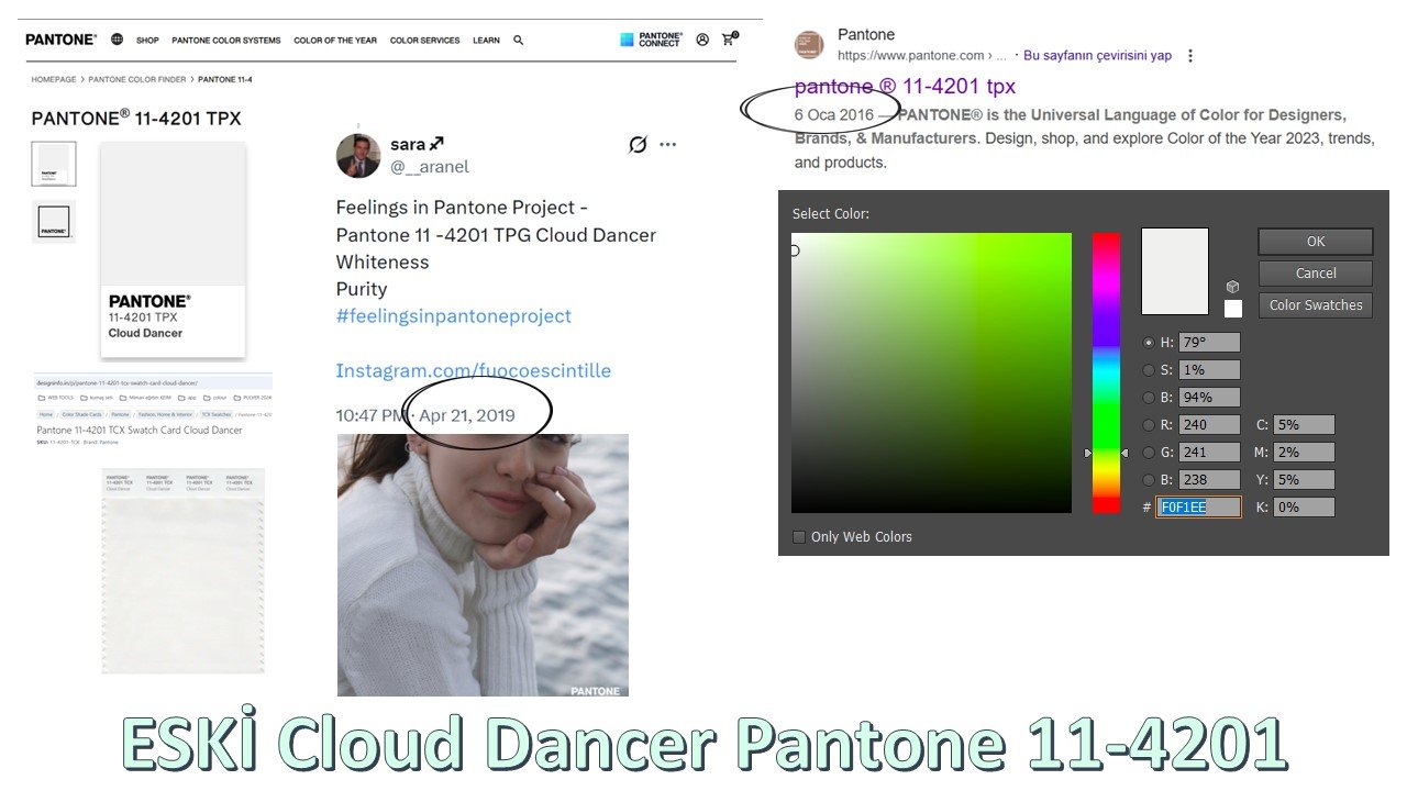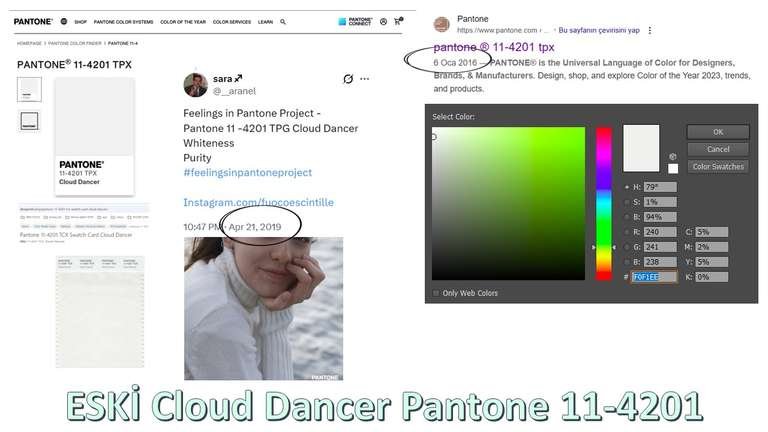 Elime aldığım eski bir Pantone kartelasında aynı 11-4201 koduna sahip Cloud Dancer’a bakıyorum... Ve rengin soğuk bir ton olduğunu görüyorum. Bu yazıyı yazana dek, ring light altında (şu dairesel influencer aydınlatan nesne) ışık ısısı ayarını defalarca değiştire değiştire baktım. Dedikleri gibi mi, gördüğüm gibi mi diye..