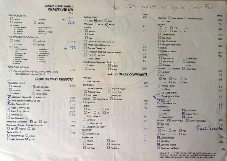 Eğitimimi aldığım günlerde de (eğitimin son günü isimsiz bir renkli kozmetik firması, ürünlerini tanıtıp, satıştan komisyon teklif etmişti), mesleğimde üç-beş sene deneyim kazandığımda da (çünkü meslektaşımın franchise aldığı bir sistemde üç sene birlikte çalıştık), renk analizi uygulaması ardından "tek bir markanın" makyaj malzemelerini satmaya dair olumsuz görüşe sahiptim. Ne kadar isabetli olduğunu, annemin dokümanları ile bir kez daha teyit ettim.